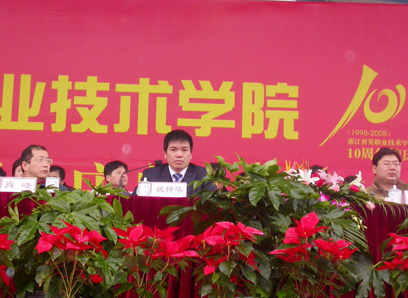 杭州经济技术开发区党工委副书记俞建国和杭州市教育局副局长肖锋到会祝贺。他们在讲话中充分肯定了学院“厚德载物、自强不息”的校训精神以及学院“自主发展、自我调控、自求发展、自强不息”的运行机制,对学院不花国家一分钱,为浙江经济和社会发展培养了8000多名高技能应用型人才,为地区发展做出的贡献。他们希望育英学院以建院10周年为新的起点,继承和发扬优良传统,强化社会责任感和历史使命感,把握发展定位,创新办学思路,以扎实的工作推进发展,以宏伟的目标凝聚人心,再接再厉,奋发有为,为早日实现具有广泛影响力的民办高职院校的目标努力奋斗。