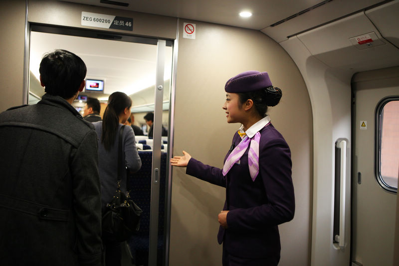 胡佳和高翔在列车长的带领下,分别负责4节车厢。按照要求,她们在发车前2小时到岗,开会交代注意事项,然后进站、上车,预先检查车上备品如安全锤、卫生纸等,站在车厢门口为乘客指引方向,然后巡视车厢,检查、调整行李箱,宣传安全知识,为乘客答疑释惑等。高铁动车上还设有包厢,为贵宾送水也是职责之一。这一切刚做完,列车已达到下一站,乘务员得马上去站岗,协助乘客上下车。有时候还要帮助没来得及买票的乘客补票。如果旅客遇到突发性问题,需要帮助,乘务员也必须在最短时间予以解决。总之,每个环节都不能出现拖拉马虎现象。