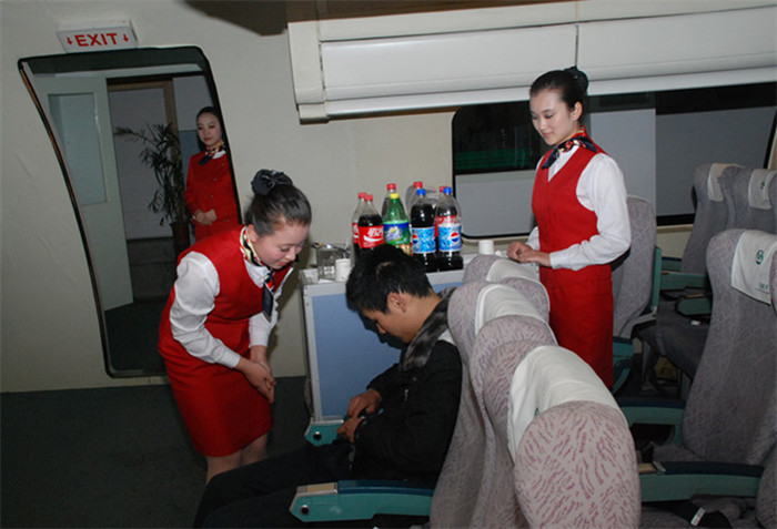 “各位乘客请注意,您所乘坐的育英号航班马上就要起飞了,请收起餐桌,系好安全带。”体验者一进入育英学院模拟机舱,空姐柔美亲切的声音就从广播中传来,乘客们犹如置身万米高空,开始享受空姐的优质服务。