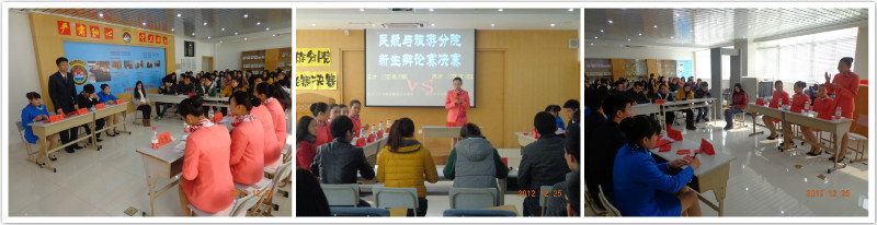 2012年12月25日中午12点30分,民航与旅游分院第十三届新生辩论赛决赛在3116安检实训室圆满结束。本场辩论赛由12空乘D班对阵12航运B班。双方的辩题分别为“提升人才培养质量注重课堂”与“提升人才培养质量注重寝室”。