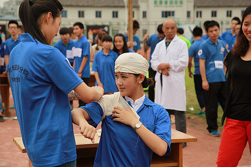 头部外伤包扎、单侧胸部外伤包扎、前臂骨折的固定、担架的制作、搬运伤员50米,参赛队员动作娴熟、准确到位、操作快速,一切紧张而有序。 6月6日下午,学院第九届卫生健康知识与救护技能总决赛隆重举行。这项比赛已连续举办9年,面向每届新生,全员参与,成为学院特色学生活动项目。