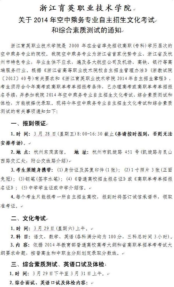 关于2014年空中乘务专业自主招生文化考试和综合素质测试
