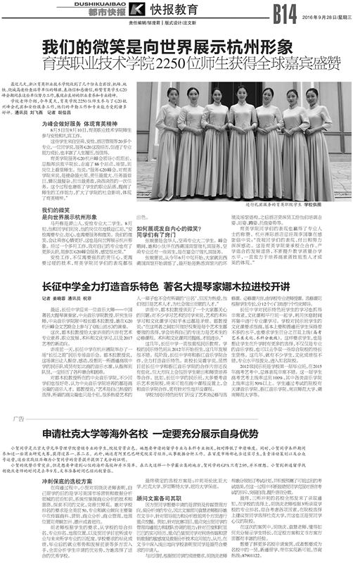 9月10日,我院最后一批服务G20的师生凯旋,育英人不辱使命,圆满完成了所有服务G20杭州峰会的礼宾和安检任务。杭州日报、浙江教育报、浙江新闻客户端、杭州网、浙江团省委头条号、杭州团市委头条号、杭州共青团微博等媒体报道了我院这次光荣而重大的任务。