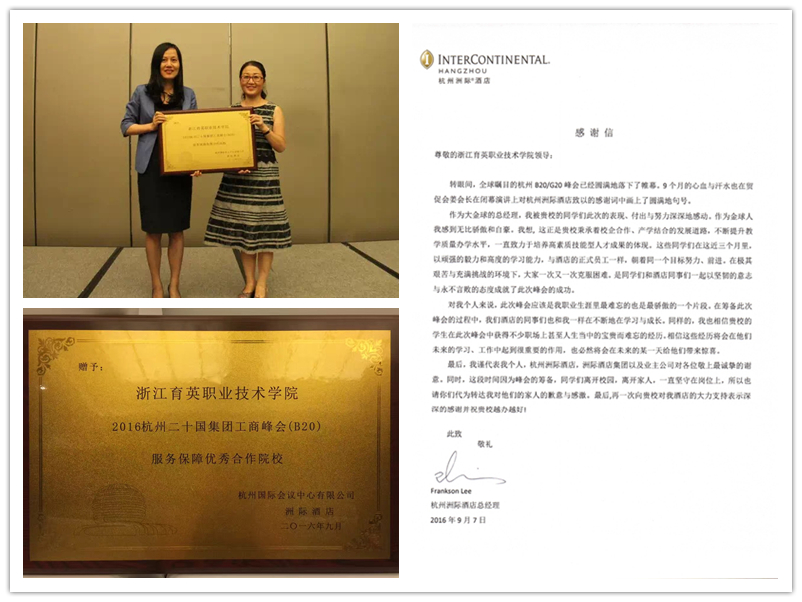 9月19日,二十国集团工商峰会杭州洲际酒店员工答谢会举行。我院应邀出席。会上,杭州国际会议中心总经理陈晓女士宣读感谢信,并向我院党委副书记、副院长谢鑫赠送B20峰会保障服务优秀合作院校牌匾。