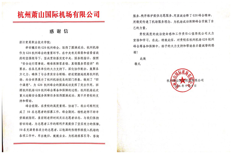 杭州萧山国际机场发来感谢信
