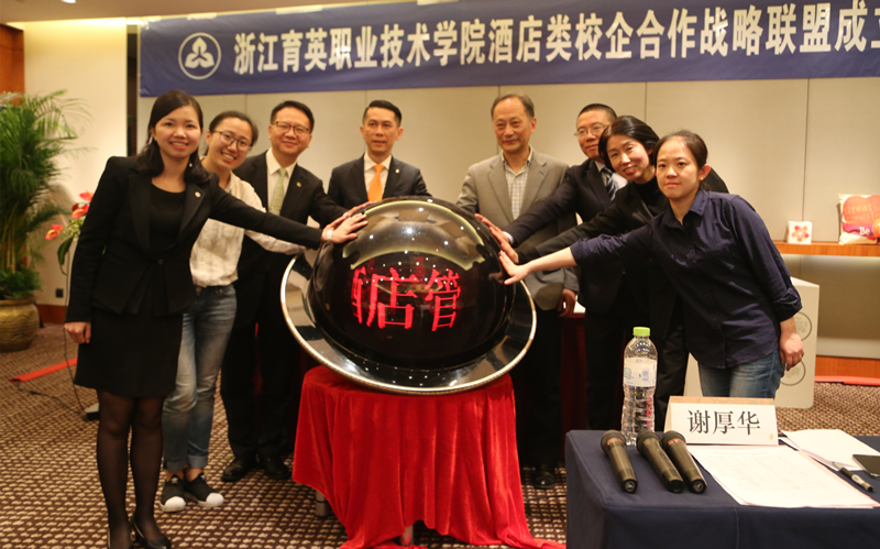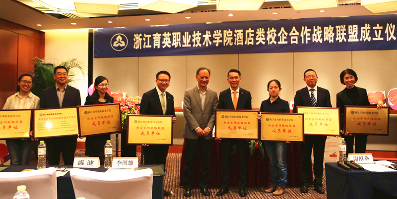 4月25日,我院携手杭州国际会议中心有限公司洲际酒店、杭州黄龙饭店有限公司、纳德酒店股份有限公司、杭州柏悦酒店、杭州JW万豪酒店、杭州西溪喜来登度假大酒店、杭州温德姆至尊豪庭大酒店七家酒店,以团体合作的形式,在洲际酒店举行了高端酒店管理人才培养战略联盟成立仪式。