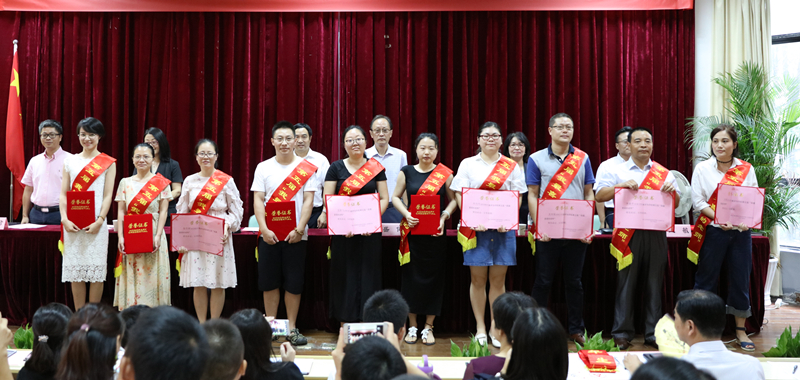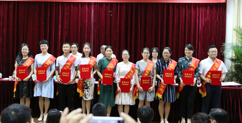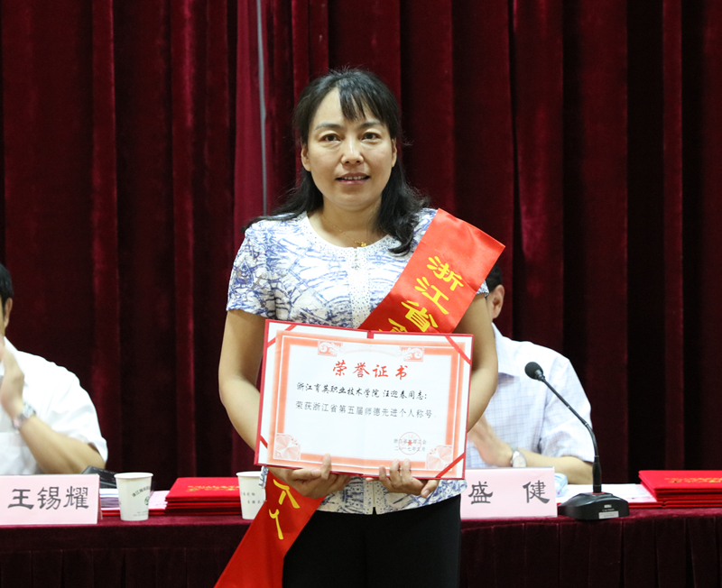 谢鑫宣读表彰文件,表彰浙江省师德先进个人汪迎春,杭州市师德标兵季勋龙,黄炎培优秀理论成果奖徐晓斌,黄炎培杰出教师奖汪迎春,杭州市优秀教师陈贤平,杭州市优秀教育工作者王敏,杭州市教育局系统优秀教师徐丹、石华玲、张竹婷、俞敏燕、吕串、金海伟、周岚,杭州市教育局系统先进工作者夏瑛,学院第五届“我最喜爱的老师”王琼、李清平、吴有权、叶巧巧、沈霞、王亦飞、吴良勇、张竹婷、杨芬、阮澎飞。