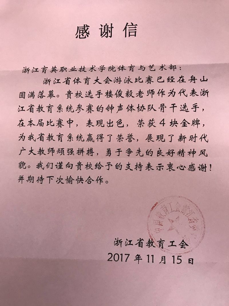近日,浙江省教育工会向学院发来感谢信,肯定楼俊毅的突出表现,并向我院给予的支持表示感谢。
