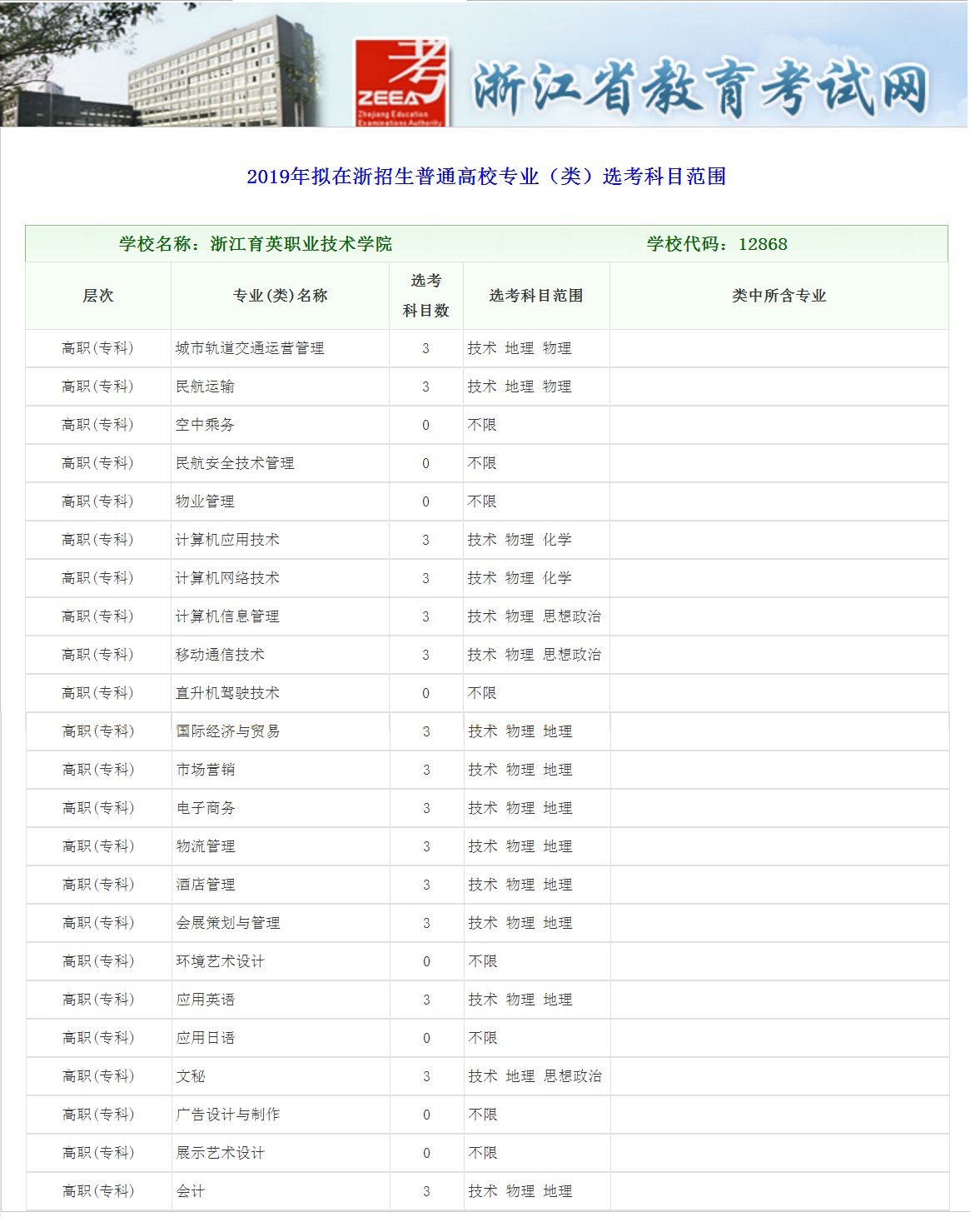 学院2019年在浙招生普通高校专业(类)选考科目范围