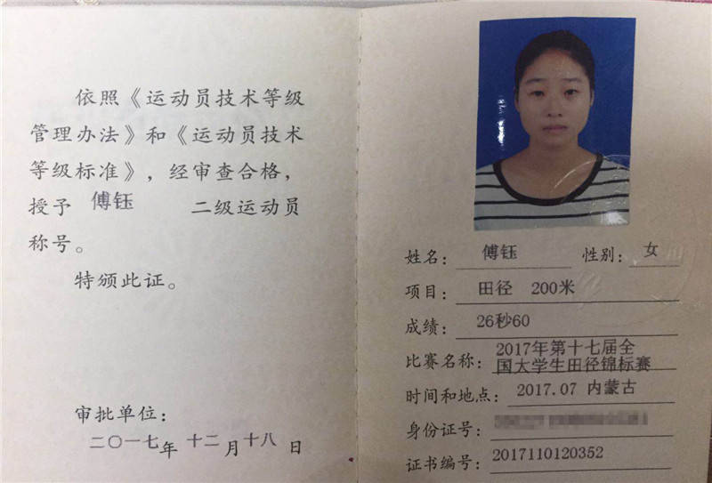 傅钰,16直升机班,曾获2017年第十七届全国大学生田径锦标赛女子200米第一名、女子100米第二名、女子4×100米接力第一名、女子4×400米接力第一名;2017年浙江省大学生田径比赛女子100米第三名、女子200米第三名、女子4×100米接力第一名、女子4×400米接力第一名;2017年浙江省大学生田径精英赛女子100米第二名、女子200米第二名、女子4×100米接力第一名、女子4×400米接力第一名。