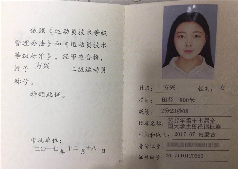 方兴,15空乘J班,曾获2017年第十七届全国大学生田径锦标赛女子800米第一名、女子1500米第一名、女子4×100米接力第一名、女子4×400米接力第一名;2017年浙江省大学生田径比赛女子800米第一名、女子1500米第一名、女子4×100米接力第一名、女子4×400米接力第一名;2017年浙江省大学生田径精英赛女子800米第一名、女子1500米第一名、女子5000米第六名、女子4×100米接力第一名、女子4×400米接力第一名;2016年浙江省大学生田径比赛女子400米第一名、女子800米第一名、女子1500米第一名、女子5000米第一名;2016年第十七届全国大学生田径锦标赛女子400米第四名、女子800米第四名;2015年浙江省第十四届大学生田径运动会女子800米第一名、女子1500米第一名。