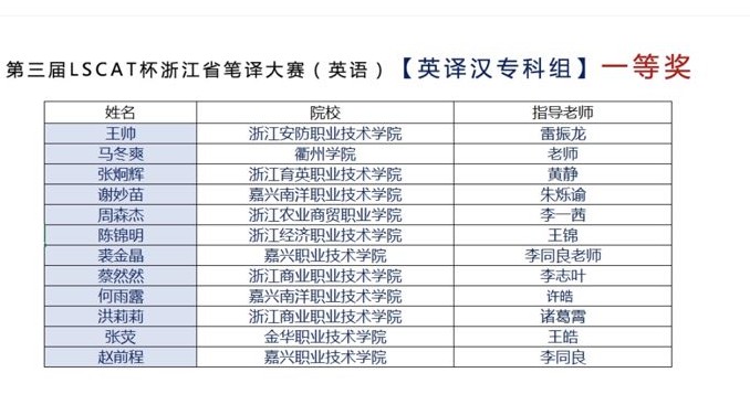 应用英语专业学生获“LSCAT杯”浙江省笔译大赛一等奖