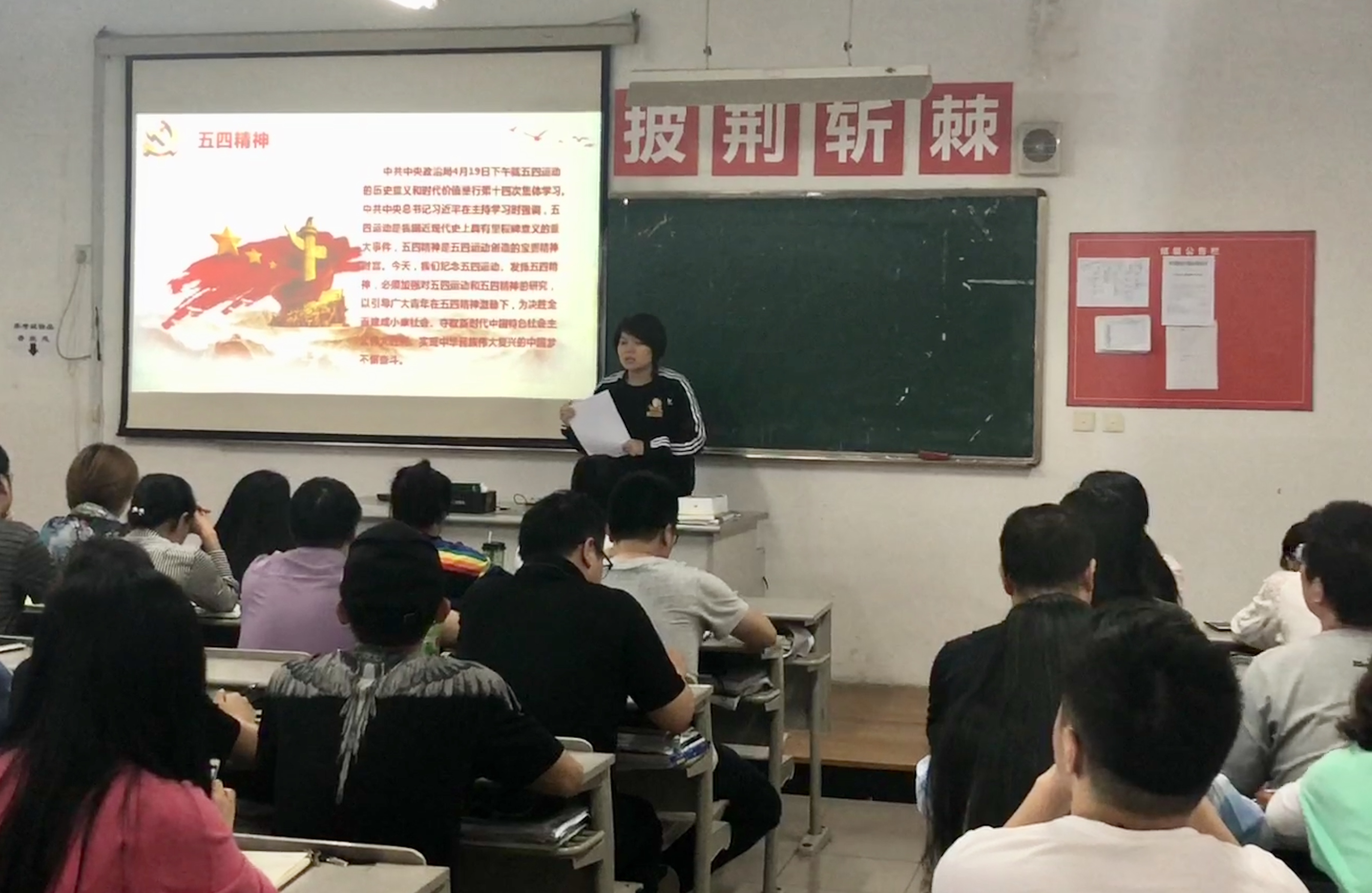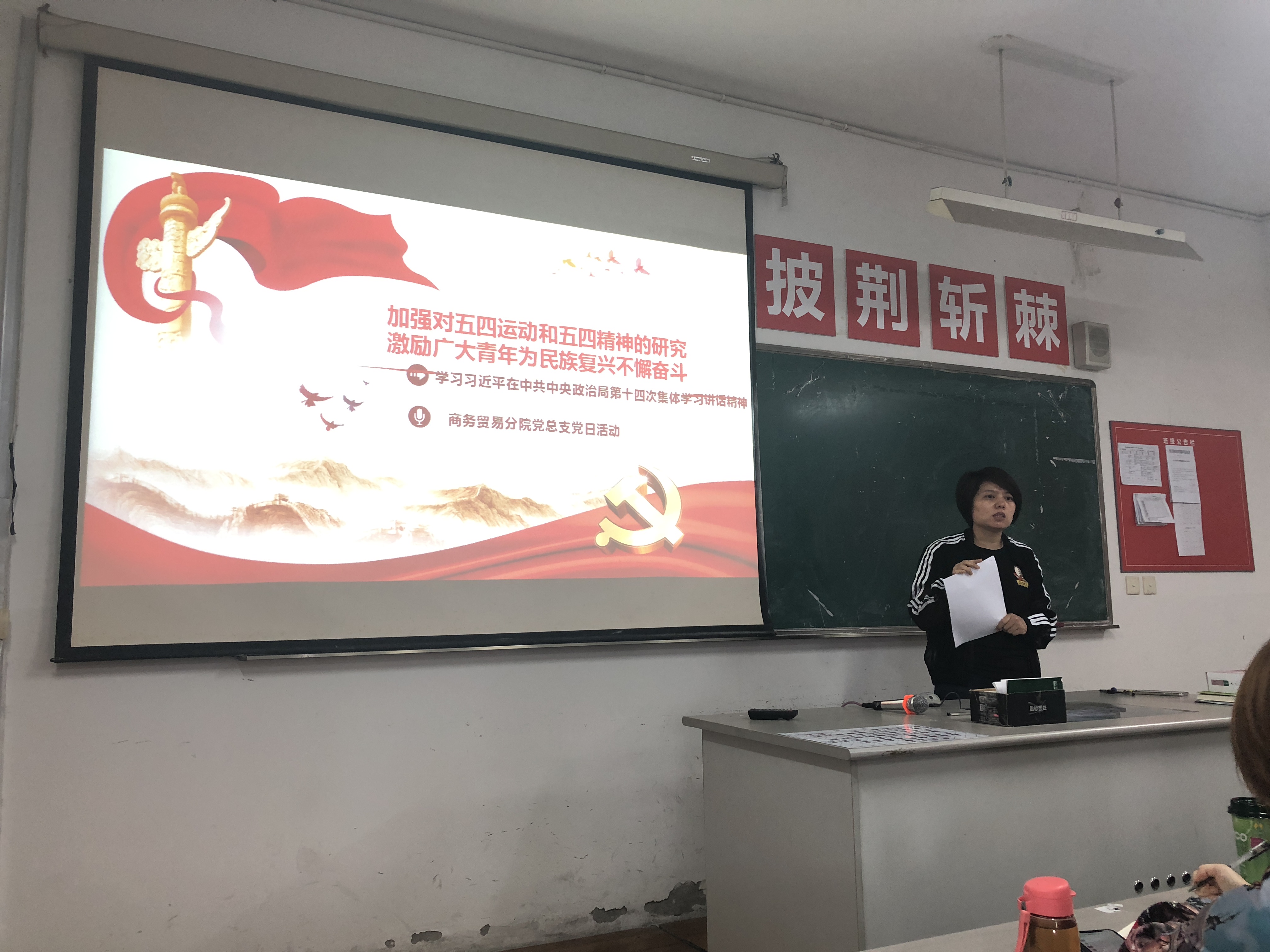 2019年4月25日中午,商务贸易分院党总支在3324教室,举行“传承五四精神,践行时代使命”主题学习活动,以此来庆祝“五四”运动100周年。分院全体教师党员和在校学生党员参加,由教工支部书记傅祝屏主讲。