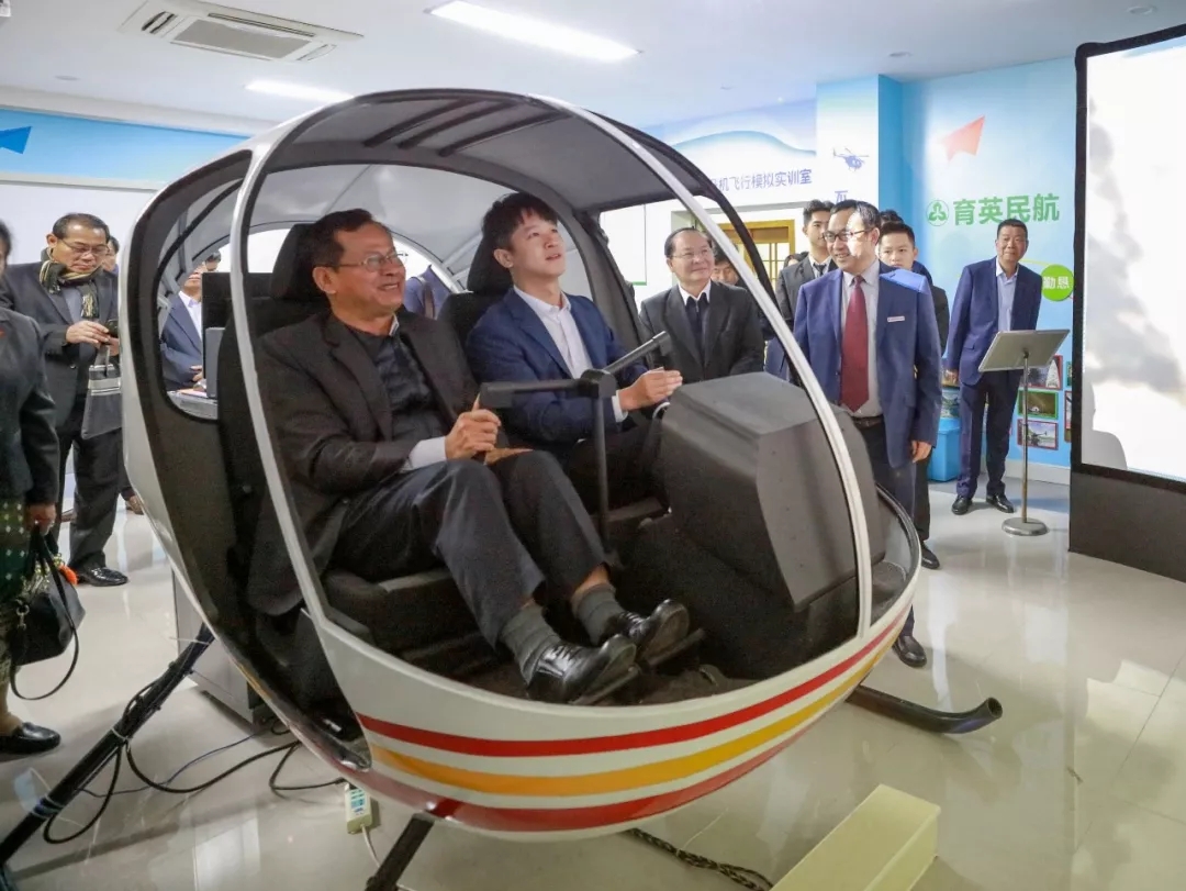 考察团一行参观了330空客全真模拟客舱服务实训舱、R22直升机模拟实训舱、跨贸实训基地、校史馆等。