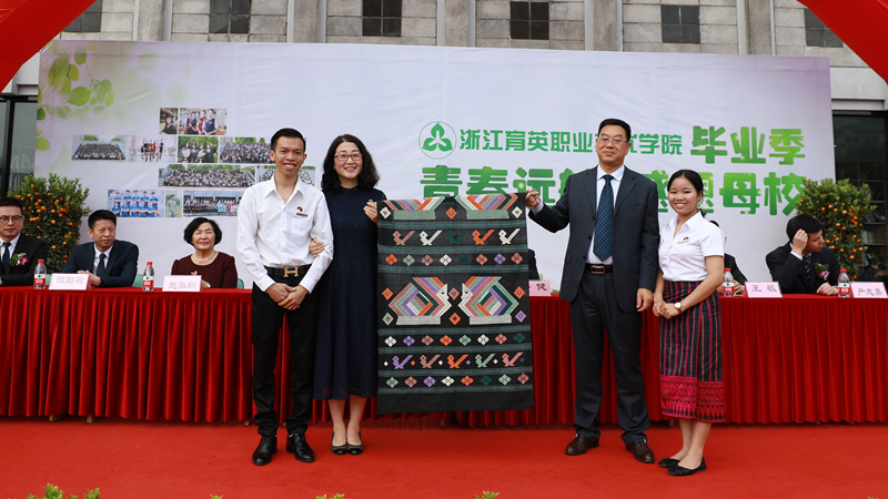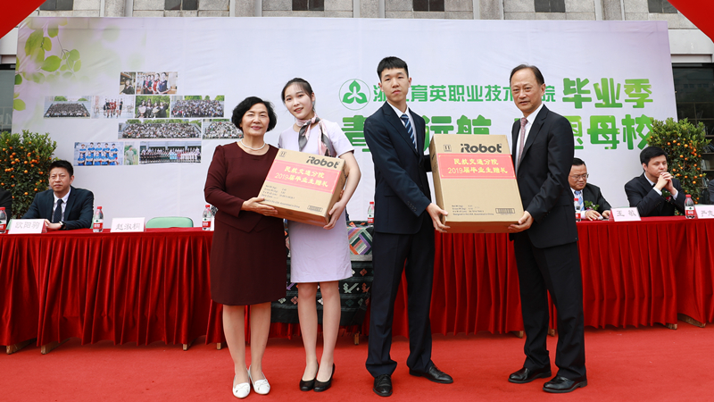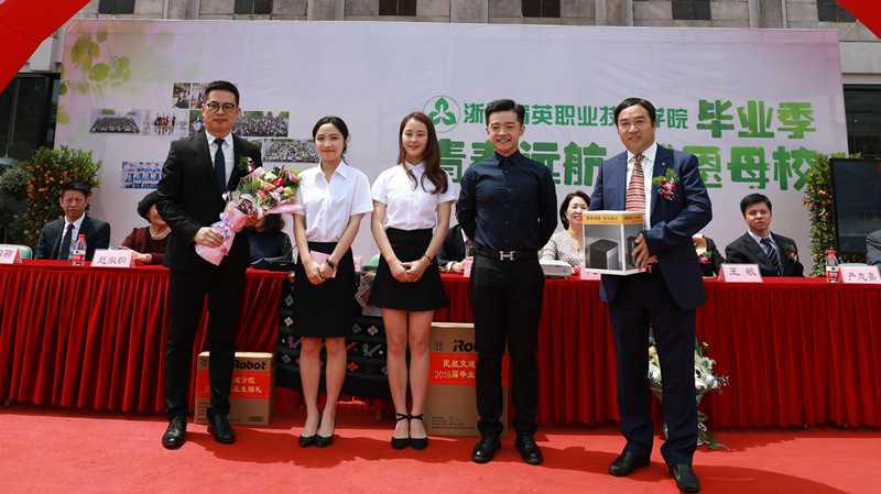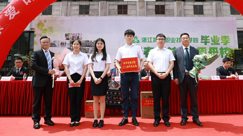 毕业典礼第二场在教学楼广场上举行。党委书记、常务副院长王锡耀主持真情回报母校环节。毕业生们献上精心准备的礼物,回报母校的培育之恩。