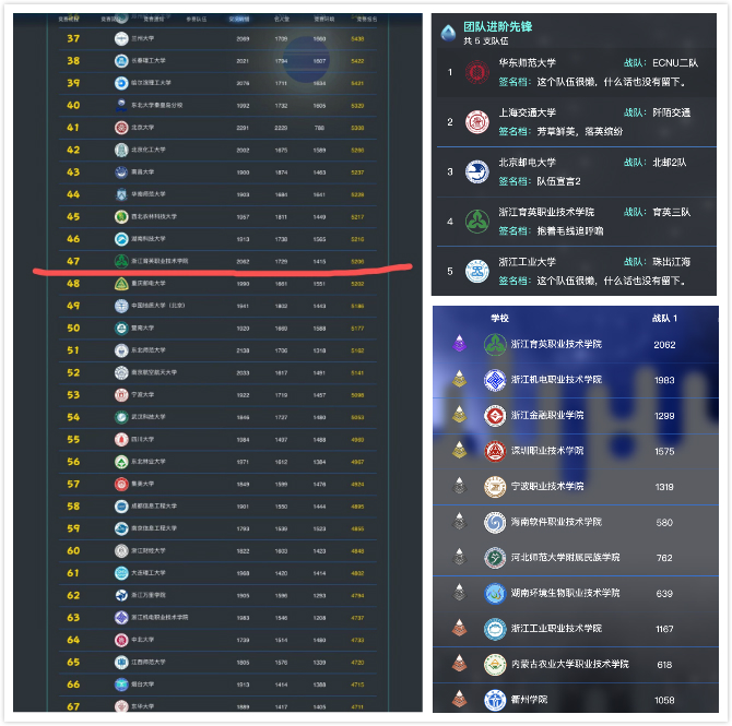 信息技术分院选派了30名同学分三个战队参加了此次竞赛。备赛期间,创意班同学早八晚十,一天14小时的训练量集训三周无休,平均每人近万行的代码量并最终获得特等奖!即使是在300多所本专科高校的总排名中也位列第四十七名,其中育英三队获得2062分的团队总分,也是沧海竞舟队伍中唯一团队总分突破2000分的队伍,即使在华山论剑组(本科组)进行排名,也可以获得金奖!同时育英三队也获得了团队进阶先锋称号(全场950支队伍中仅有5支队伍可以获得该称号),再一次证明了育英学子在程序设计、算法应用领域中所具备的拔尖实力。(张弛)