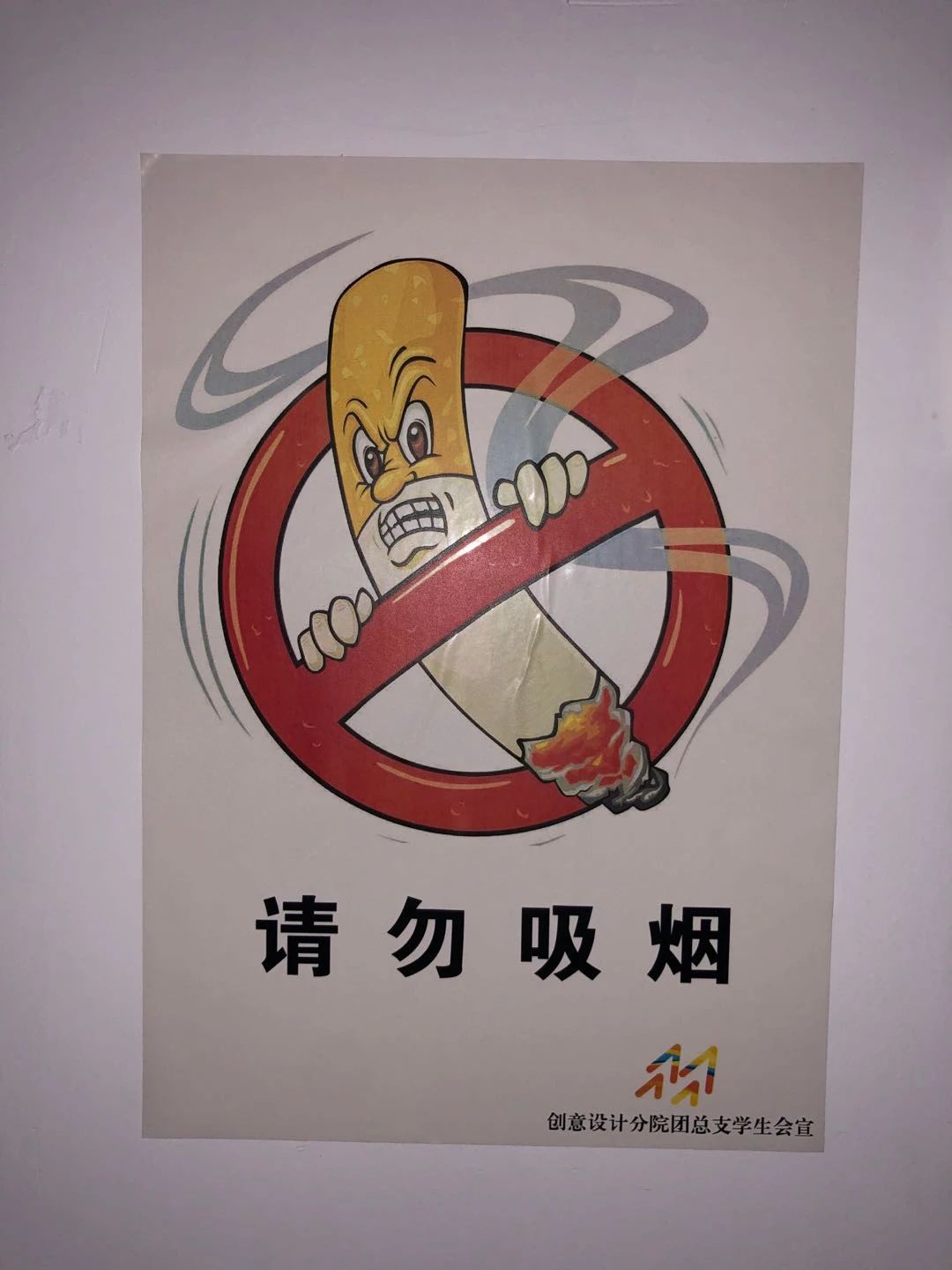 在禁烟这方面我们创意设计分院也不能落后,瞧,这是教室里的禁烟告示,教室上课的同学们看到这么可爱的告示,也不会忍心不遵守它的吧!