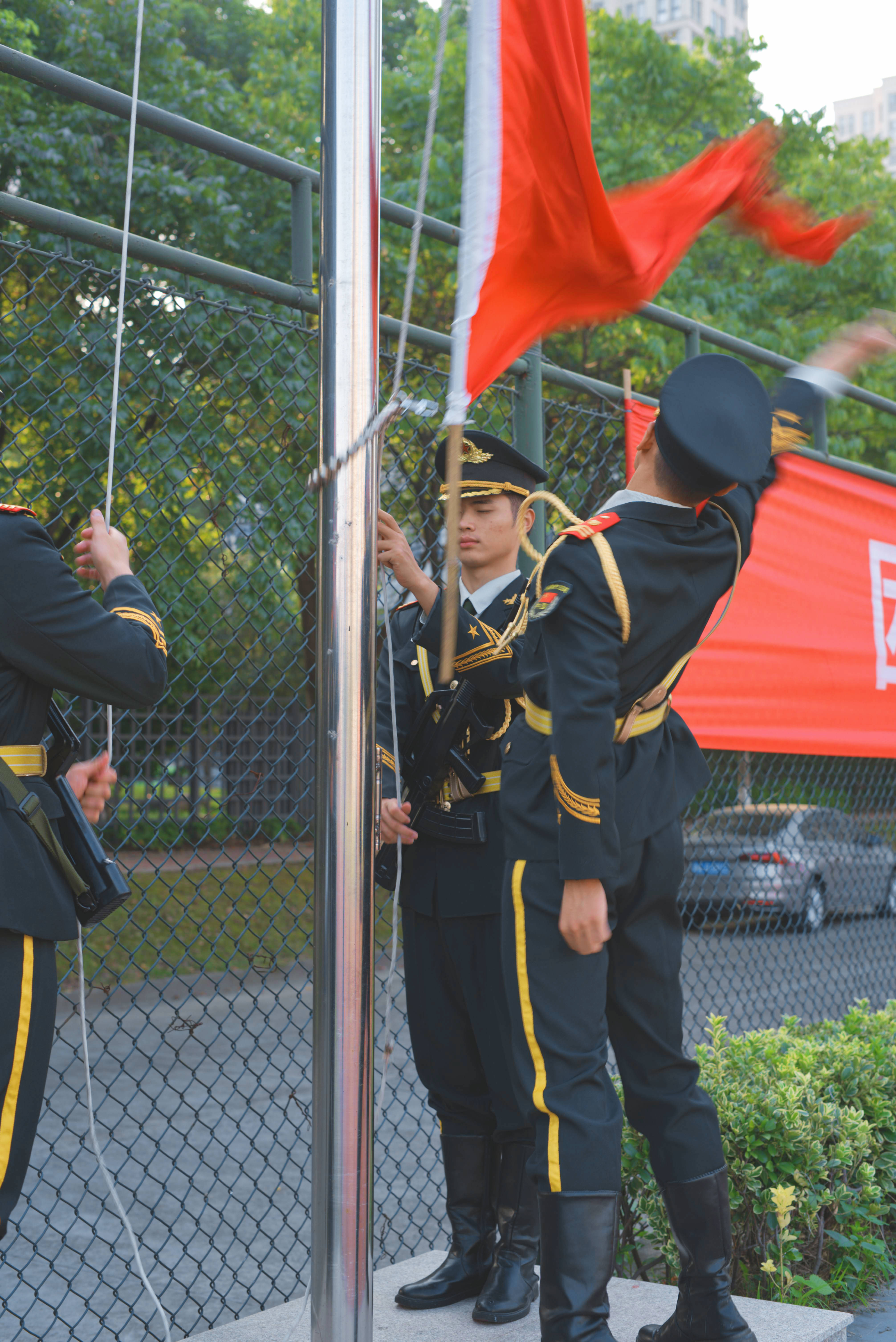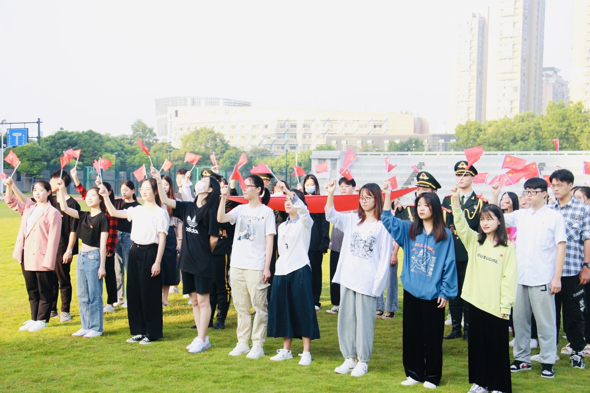 2020年10月1日上午7点整,在学院操场国旗台下,我们举行了“传承红色基因 ,续写时代华章”升旗仪式。伴随着《义勇军进行曲》,“荣伍社”国旗护卫队,精神抖擞、整齐划一,迈着铿锵有力的步伐,护卫着五星红旗入场,升旗手振臂一挥,这就是你们的荣耀!