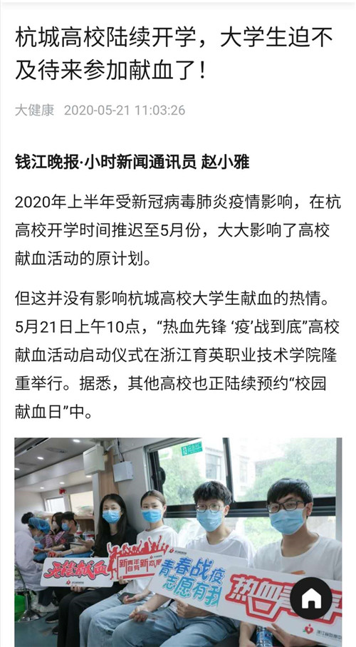 据了解,继育英之后,杭州电子科技大学已定于本周六、日开展献血活动,杭州万向职业技术学院、中国美术学院等高校正陆续预约“校园献血日”中。