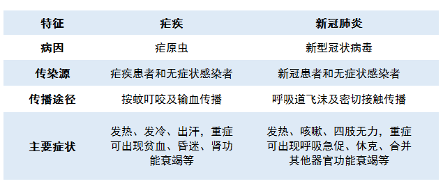 因此,今年4月26日第13个“全国疟疾日”的主题“消除疟疾控新冠,同防输入再传播”,疟疾会出现与新冠肺炎类似的发热症状,如果不仔细甄别可能会漏诊或误诊。其实,两种疾病还是有很大的区别,下面对疟疾和新冠肺炎从原因、传染源、传播途径、主要症状等方面进行对比: