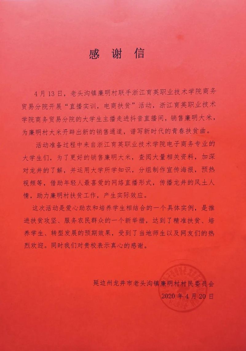 直播活动吸引了学院领导、师生和大量网友的关注,带动了大米的销售。通过努力,在五天的直播实训活动中为廉明村售出1000余公斤大米。“直播实训,电商扶贫”活动得到了龙井市有关部门的关注,当地的“龙井扶贫”公众号对此次直播活动进行报道。廉明村村委领导专门给学院发来感谢信,表达了对此次合作的肯定以及对校园主播们的鼓励。