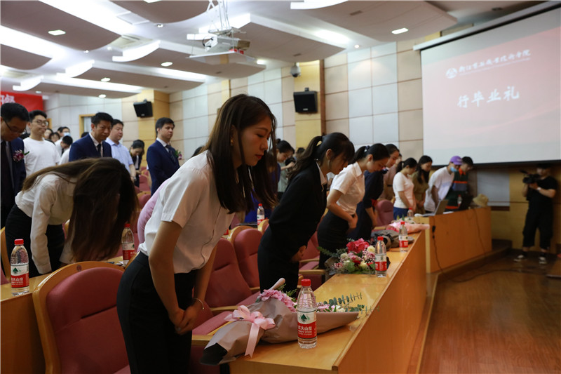 全体毕业生在谢鑫的主持下,举行了毕业礼,毕业生代表向教职工代表、家长代表、企业代表献花。