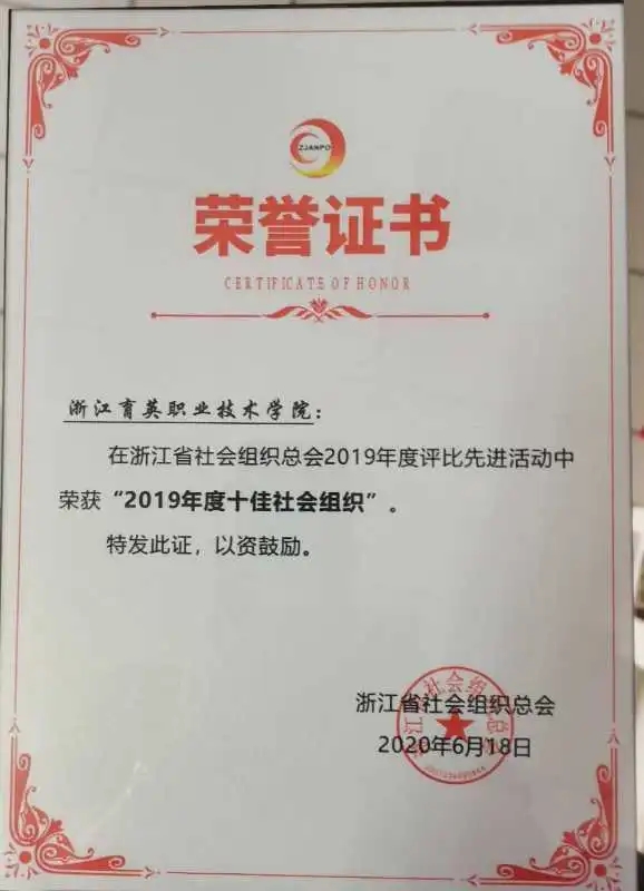 2020年7月16日,浙江省社会组织总会召开2019年度评比先进表彰大会,育英学院被评为2019年度“十佳社会组织”。