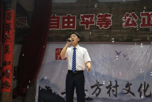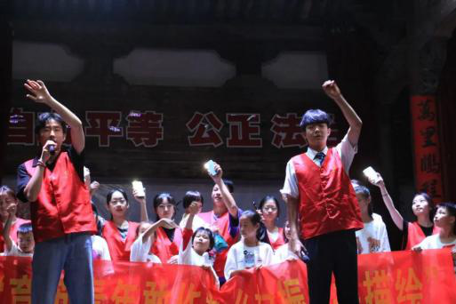 此外,实践团还携手部分村民,在大慈岩镇上吴方村方正堂古戏台举办文艺汇演。师生们在礼堂里与村民们联袂举办“本土+校园”式的纳凉晚会,打造了与众不同的精彩“村晚”。本次文艺汇演不仅为青年大学生提供了走出校门、走向社会、展现自我的舞台,更有利于进一步宣传党和国家的乡村振兴战略,助力美丽乡村建设,获得在场100多位村民点赞。展演的节目都是实践团成员自编自导自演,特色礼仪操展示、手绘T恤走秀、气势高昂的朗诵,活力的街舞、美妙的歌曲等精彩节目拉近了与村民的距离,产生了良好的互动,有助学生更加深入了解了国情社情,提高了实践育人实效。晚会丰富了村民的娱乐文化生活,提高了广大群众主动融入本村文化礼堂的意识,让古老的戏台焕发了青春活力。