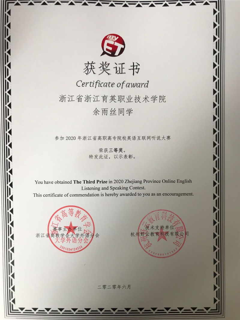 近日,2020年浙江省高职高专院校英语互联网听说大赛成绩公布,经济管理分院2018级英语专业学生高源获一等奖,2018级英语专业学生余悦、蒋盼、叶澄,2017级英语专业学生余雨丝获三等奖,2018级酒店管理专业洲际班学生吴迎灿获优胜奖。指导教师为沈晚笑、葛秀华。