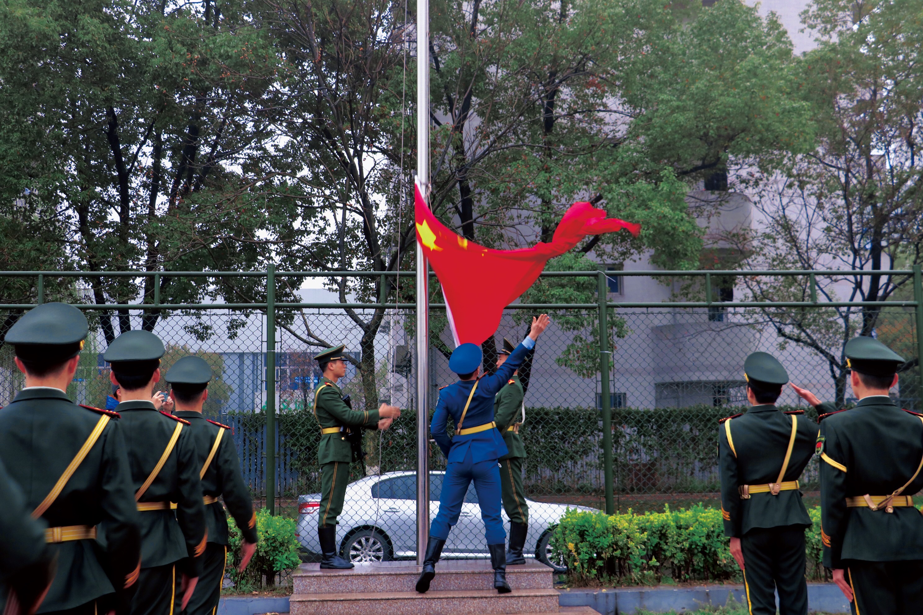 国歌响起,国旗飘扬,护旗手们脸上带着庄重带着幸福齐刷刷地对着国旗敬礼,所有人的目光都注视着徐徐上升的五星红旗。
