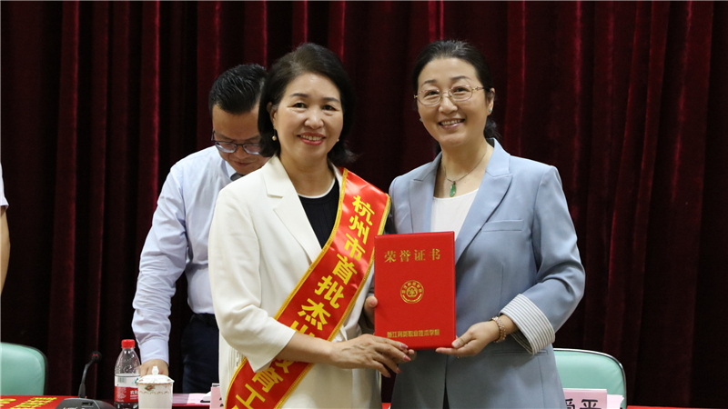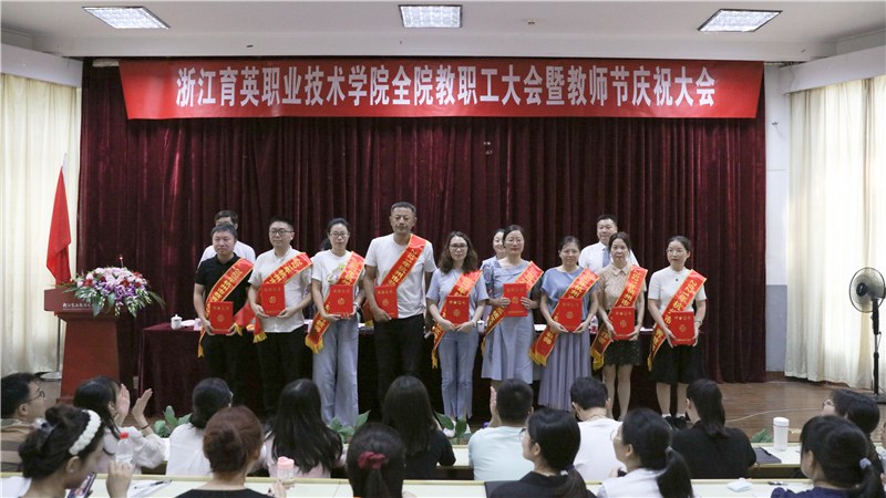 谢鑫宣读会议表彰文件。杭州市首批杰出教育工作者、杭州市优秀教师、杭州市优秀教育工作者、杭州市教育系统优秀教师、杭州市教育系统优秀工作者、育英校友奖教金获得者、第20届中国大学生田径锦标赛获奖教练团队、2021年浙江省高等职业院校教学能力竞赛获得者受到表彰。