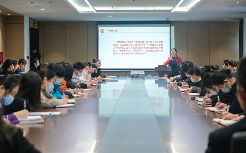 谢鑫从党的十九届六中全会的基本概况,深刻领悟全会重大意义,准确把握六中全会精神的精髓要义,贯彻落实全会精神等方面,详细阐释了历史上的三个决议、一个根本问题、两个确立、马克思主义中国化的三次飞跃、百年历程创造的四个伟大成就、党的百年奋斗的五大历史意义、十大历史经验等。她指出,党的十九届六中全会是在我们党百年华诞的重要时刻、在“两个一百年”奋斗目标历史交汇关键节点上召开的一次重要会议。全院师生要深入学习领会,广泛宣传宣讲,抓好贯彻落实,切实把思想和行动统一到党的十九届六中全会精神上来,以学习全会精神为重点,巩固党史学习教育成果,进一步做到学史明理、学史增信、学史崇德、学史力行。