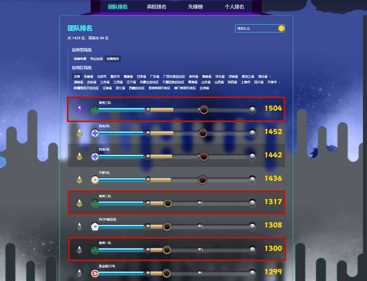 本届天梯赛分为珠峰争鼎(本科组)、华山论剑(本科组)和沧海竞舟(专科组)三个组别。受疫情影响,采用线上比赛的方式进行。来自430所高校的1429支队伍报名参赛,每支参赛队伍由10名同学组成,每所高校前3名队伍总分累加进行高校排名。