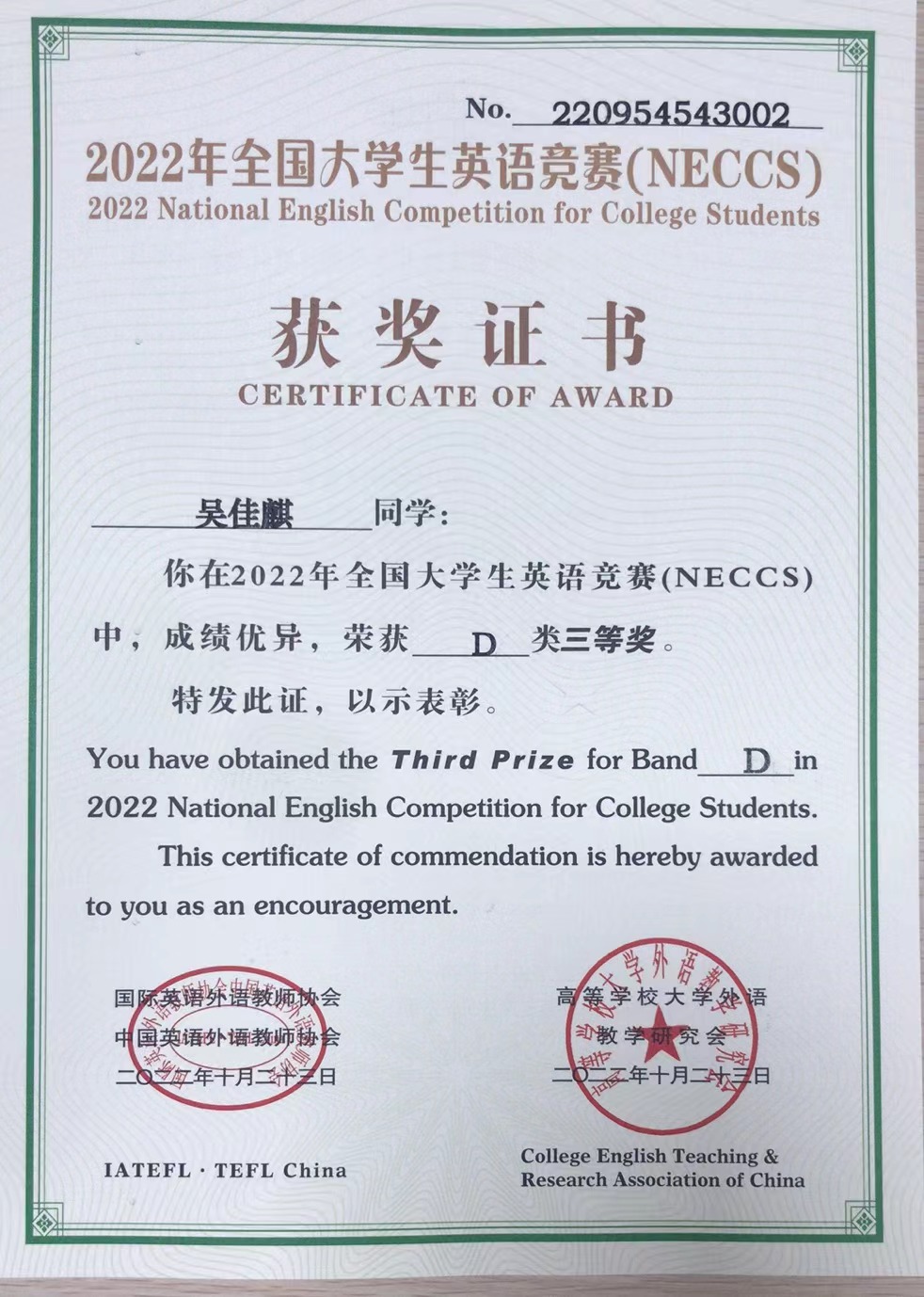 2022年全国大学生英语竞赛(NECCS)全国决赛于2022年10月23日落下帷幕,全国24个省级赛区顺利进行。智慧旅游学院21级酒店专业学生郝露筱、连航宇、吴佳麒三位同学参加2022年全国大学生英语竞赛(NECCS)获得二等奖、三等奖。