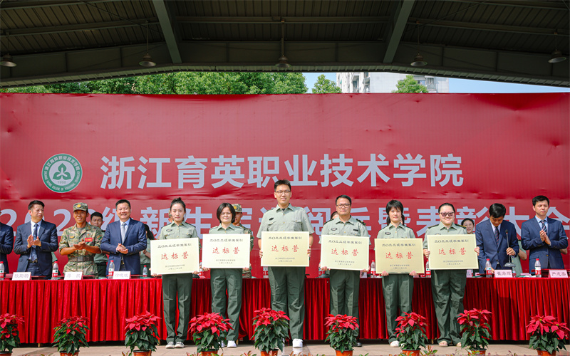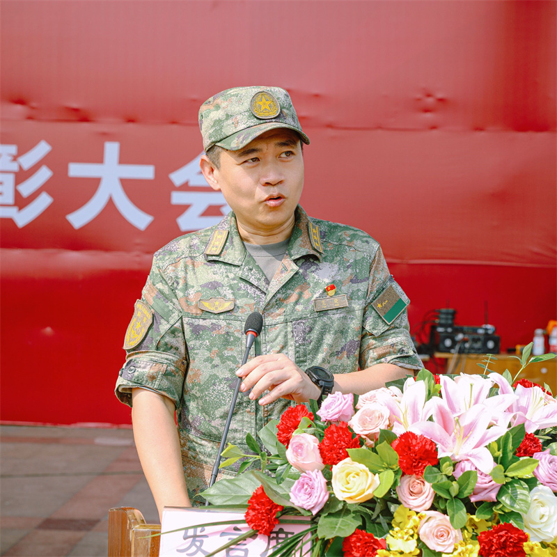 军训团副参谋长邬佳宣读表彰文件。6个军训达标营、24个军训优秀连队、24个军训内务优秀连队、24个军训内务优秀寝室代表、24个军旅歌曲优秀连队,24名军训优秀士兵代表,24名优秀教官上台接受表彰。