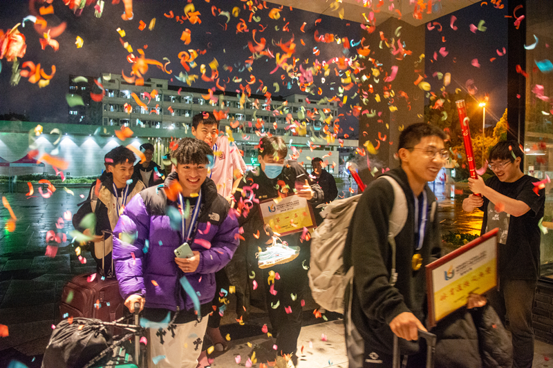 11月28日晚,副校长王敏、徐晓斌,部分师生代表在教学区广场热烈欢迎篮球队健儿们凯旋,并为运动员和教练员献上鲜花。