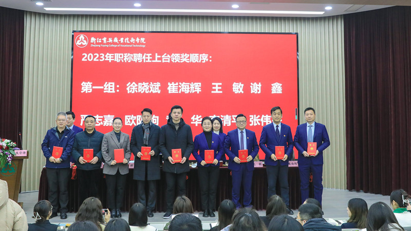 王敏宣读教师专业技术职称聘任文件和在我校工作五年及以上教职员工表彰决定。校领导为代表颁发聘任证书,为在育英学院工作五年及以上教职员工颁发纪念牌和纪念盘。