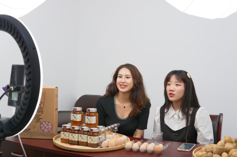 网络营销与直播电商专业师生在洞坑口村党群服务中心搭建完成临时“直播间”,“数商新农促共富”直播活动准时开播,为村民推介特色农产品。指导老师夏美馨和学生金碧洋共同担任直播销售活动主播,介绍展示了洞坑口村养殖的土鸡和土鸡蛋,出产的富硒土豆、天然蜂蜜等优质农产品。村书记张爱娟作为好物推介官,现身直播间,与师生主播“搭档”带货。运营团队也及时进行数据分析,精准引流,调整销售策略,提高商品点击率和成交率。