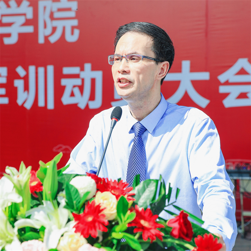 丁金昌致辞。他代表学校对2023级全体新生表示热烈欢迎,向为培育同学们健康成长成才默默奉献、辛勤付出的家长、老师以及长期以来支持学校军训工作的73021部队全体官兵表示衷心感谢。