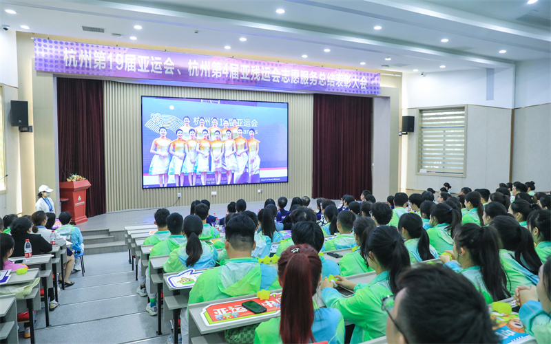 党委副书记、副校长王敏讲话。他向圆满完成亚(残)运会服务保障工作的每一位育英师生表示敬意,向亚组委对学校的信任、支持与指导致以感谢。他指出,学校近300余名学生、11位教师参与亚(残)运会服务,向世界展示了育英人的微笑,让世界见证了属于中国的荣光。亚运会,93名颁奖礼仪服务16个竞赛场馆21项竞赛大项,“高标准”、“零失误”完成107场颁奖仪式,颁出976枚奖牌。亚残运会,67名颁奖礼仪,服务9个场馆10项竞赛项目共计完成90场颁奖仪式,颁出524枚奖牌。我校7名礼仪志愿者圆满完成亚残运会44个代表团17场欢迎仪式。98名亚残运会志愿者服务临平体育中心坐式排球项目累计5390余小时。29名医疗服务志愿者在开闭幕式、钱塘、淳安等11个场馆11项赛事累计服务5605小时。1名在校生和2名校友入选亚运会火炬手,2人入选亚残运会火炬手。师生收到40余封感谢信。先后被中央电视台新闻联播、央视新闻、学习强国、浙江卫视、潮新闻、杭州电视台等媒体和平台报道。王敏以“感谢、祝贺、羡慕”三个关键词肯定师生在亚(残)运会的优异表现。他希望同学们透过“亚运之窗”感受中国精神,激发追求卓越的精神品质,学榜样坚定信念,学榜样拼搏奋斗,做“有理想、有本领、有担当”的青年;希望同学们继续发扬“奉献、友爱、互助、进步”的志愿精神,增强服务意识,锤炼意志品质,提高服务能力,用实际行动唱响“我在窗口写青春,争做最美小青荷”的时代强音。