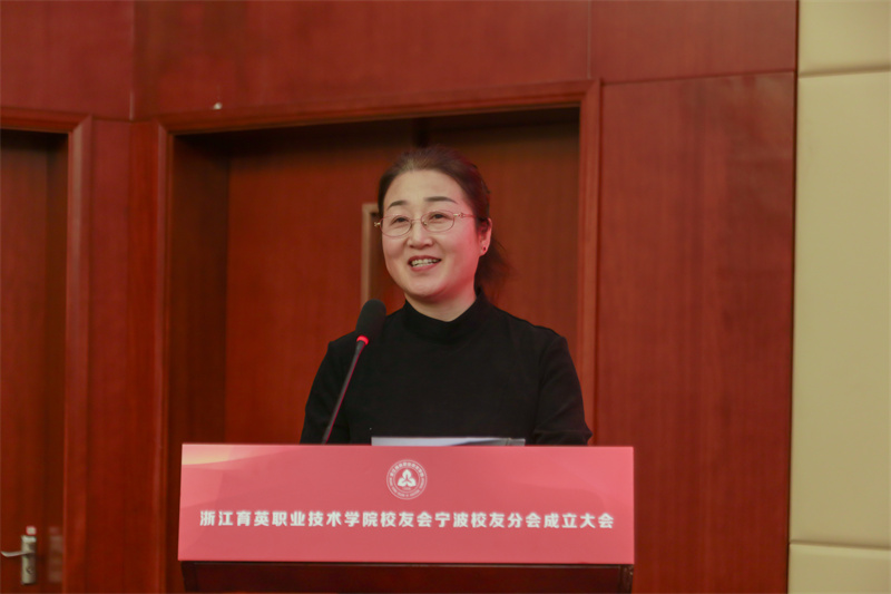 谢鑫发表讲话。她代表学校向广大校友们表示衷心感谢。她说,学校成绩的取得、学校的发展、学校赢得社会尊重,得益于全体师生的共同努力,得益于一届又一届育英校友的接续奋斗,校友们和广大师生员工一起,是学校发展的参与者、建设者,也是见证者和受益者。校友们在各自领域中做出贡献,也是育英学院对社会的贡献。校友的成就,是教师职业价值的体现,也是学校的价值所在。校友是母校的名片,是学校办学的一面旗帜、一把尺子,是学校最宝贵的优质资源和学校事业发展最可信赖的力量。广大校友凭借着扎实的专业知识、务实的工作作风、进取的精神风貌、勇立潮头的精神,在各自的领域内辛勤工作、建功立业,为母校赢得了社会各界的认可。宁波校友分会成立,意义重大。相信在学校和校友总会的指导下,宁波校友分会一定可以团结更多力量,整合更多资源,承载更大梦想,实现更高理想。谢鑫希望宁波校友分会进一步增强做好校友工作的责任感和使命感;进一步健全工作机制,推动校友工作协调开展;进一步强化交流合作,积极赋能学校和校友发展;进一步总结办会经验,为其他地区建立校友分会提供借鉴。