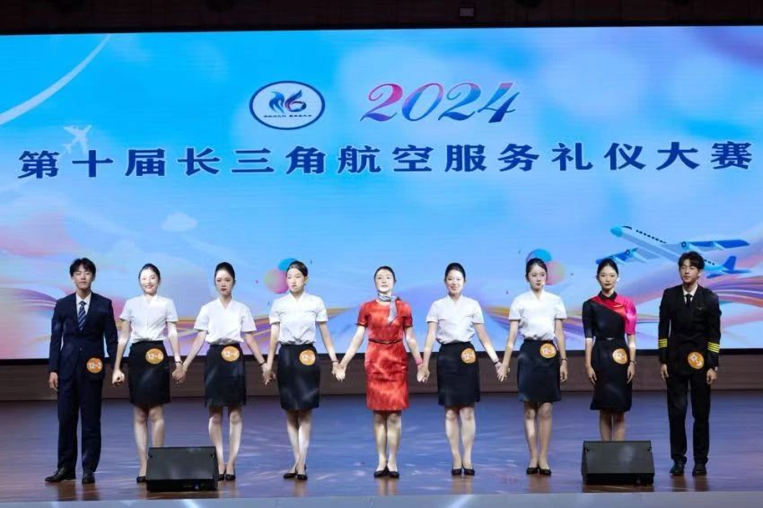 11月14日,“学航空礼仪,展青春风采”第十届长三角航空服务礼仪大赛在中航未来华东航空实训基地举行,我校民航交通学院空中乘务专业9名学生参赛,获团体一等奖,其中24空中乘务五年制B班王雪彤获礼仪之星,24空中乘务五年制B班谢嘉怡获风采之星。领队郑天阳,指导老师娄雨冰、朱麒铭。