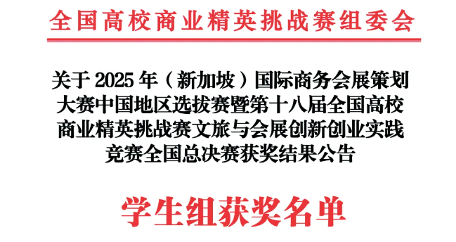 竞赛由中国国际贸易促进委员会商业行业委员会、中国国际商会商业行业商会和中国商业经济学会联合主办,全国近百所本科和高职院校相关专业学生共计3506件作品参赛。作为全国会展行业享有盛誉的综合性大赛,文旅与会展创新创业实践竞赛已连续多年被纳入学科竞赛排行榜,是目前商科教育领域文旅与会展方向唯一纳入该榜单的国家级赛事,也是文旅与会展领域极具影响力的高水平赛事。