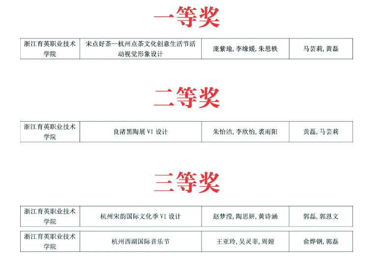 庞紫瑜、李媛媛、朱思轶团队作品《宋点好茶--杭州点茶文化创意生活节活动视觉形象设计》获一等奖,指导老师马芸莉、黄磊;朱怡洁、李欣怡、裘雨阳团队作品《良渚黑陶展 VI 设计》获二等奖,指导老师黄磊、马芸莉;赵梦滢、陶思妍、黄诗涵团队作品《杭州宋韵国际文化季VI设计》获三等奖,指导老师郭磊、郭恩文;王亚玲、吴灵菲、周娅团队作品《杭州西湖国际音乐节》获三等奖,指导老师俞烨钢、郭磊。此前的省赛中,参赛队员已获得金奖和银奖各2项。