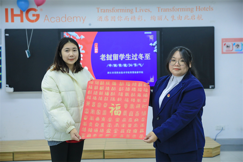 2023级酒店专业19名老挝留学生和14名班助志愿者互赠纪念品,班助们分别带来了自己书写的寓意“福气满满”的96个福字、寓意好运的兔子剪纸、寓意中老友谊“环环相扣”的熊猫钥匙扣,还有的带来了棉手套、定制水杯、书签等礼品。教室气球上系着的卡片上写满了老挝留学生对志愿者说的心里话。