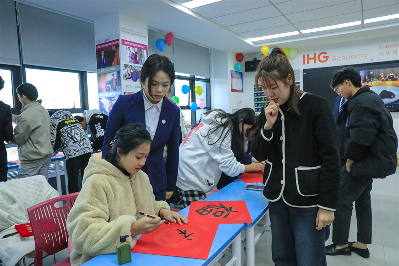 除了文化参访和民俗体验,学校还通过社团活动向老挝留学生传播中国传统文化。书法是中华民族的文化瑰宝,每当重要的节庆日都有写福、送福的风俗。在社团活动中,学校组织书法爱好者与老挝留学生一起书写“福”字。从握笔、沾墨到落笔,一笔一划勾勒中国汉字,老挝留学生在汉字书写中感悟中华文明的魅力。一张张大红字上出现了各式的“福”字,老挝留学生惊喜地拿着自己书写的“作品”拍起了照片。画脸谱、品茶香、写春联、贴福字等一系列生动有趣的活动,让老挝留学生体验了深厚的中华文化底蕴,提升了参与感、体验感和获得感。