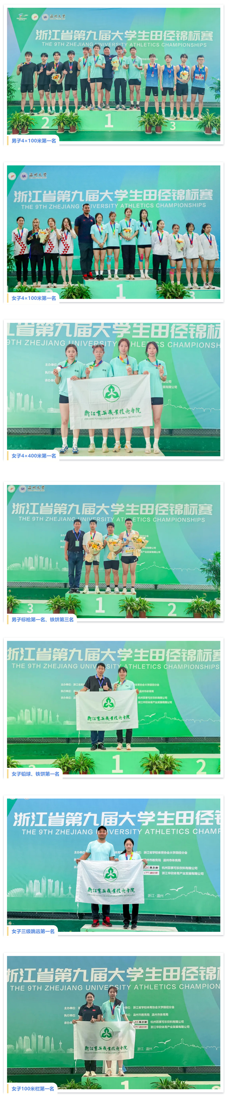 • 2023年10月24日-29日,浙江省第十六届大学生运动会田径比赛,15金7银6铜,破17项赛会纪录,总团第一。