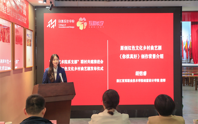 编剧、创意设计学院辅导员胡恺睿介绍创作背景。团队在暑期深入长宁村,沉浸式体验乡村生活,借鉴人类学、民族音乐学“田野调查”方法,与村民同吃住、同劳动,和乡亲们学会了“你侬真好”等建德方言,沉浸式体验“人人互助,家家受益”的美好生活,因此聚焦“互助”构思剧情,尝试“曲艺+舞台剧”的曲艺剧表现形式,形成以“生产互助劳作忙”、“生活互助笑颜开”、“精神互助展新篇”三幕故事为基础的原创作品,通过杭州小热昏“跳进跳出”的表演方式,展示在党的领导下长宁村百年来的变化。未来这部曲艺剧将作为长宁村的文旅宣传片,陆续投放到文化馆、文化礼堂等平台,广泛宣传长宁村红色历史文化,为乡村文化振兴与精神共富贡献青春文艺力量。