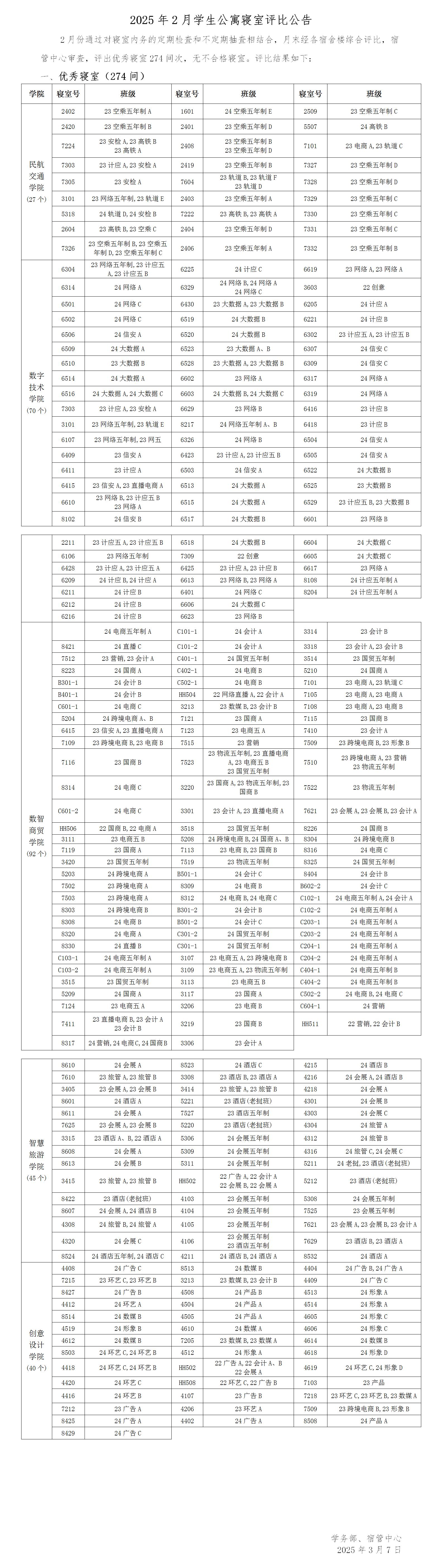 2025年2月学生公寓寝室评比情况公告