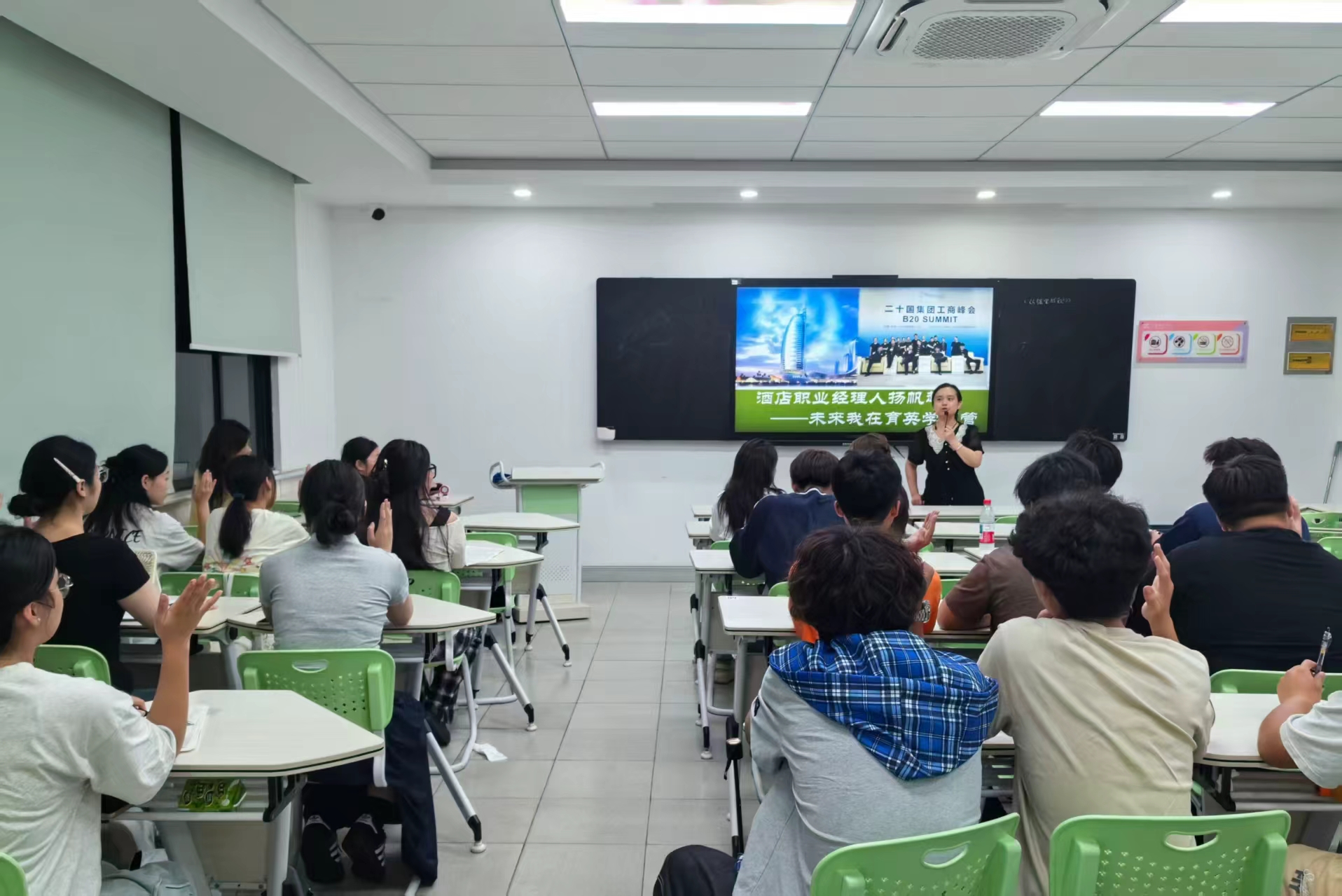 以竞赛奖杯为镜,照见“未来的自己”,各位专业导师的PPT上播放着酒店“金钥匙”工作室成绩单:全国高校商业商业精英挑战赛酒店项目总决赛一等奖、“问途杯”全国酒店数字营销大赛二等奖、一带一路金砖赛一等奖、浙江省职业院校技能大赛高职组“酒水服务”赛项铜奖、G20峰会与亚运会服务风采、各类高规格会议接待志愿服务……四位专业导师共同强调:希望大家以学长学姐为榜样,手机入袋率、抬头率、出勤率是专业“三率”红线,学好专业知识,积极踊跃参加各类专业赛事,践行“多学、多练、多看、多秀”四多锦囊,学做事、学做人。同学们就“竞赛如何选拔”、“数字化工具学习路径”、“实习企业名单”做了提问,专业导师一一做了详细的解答。